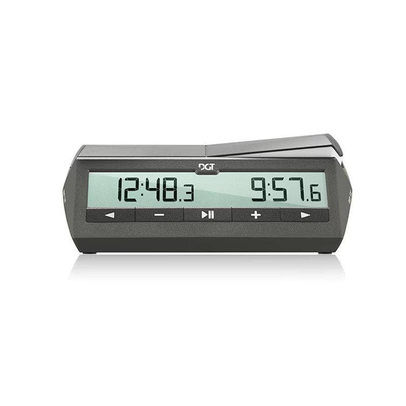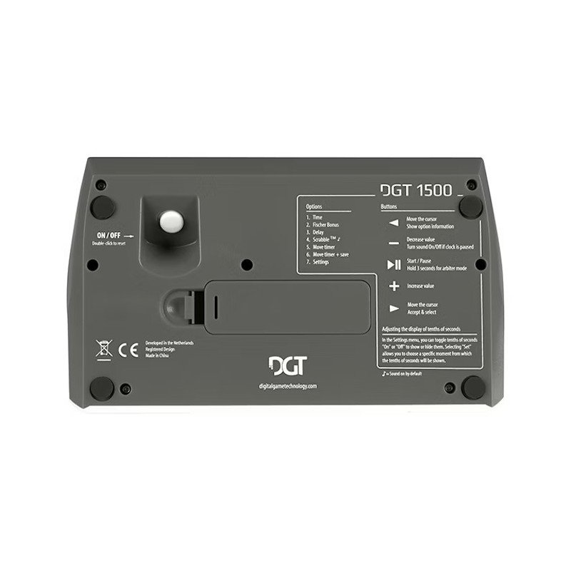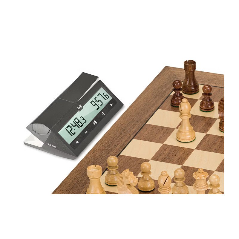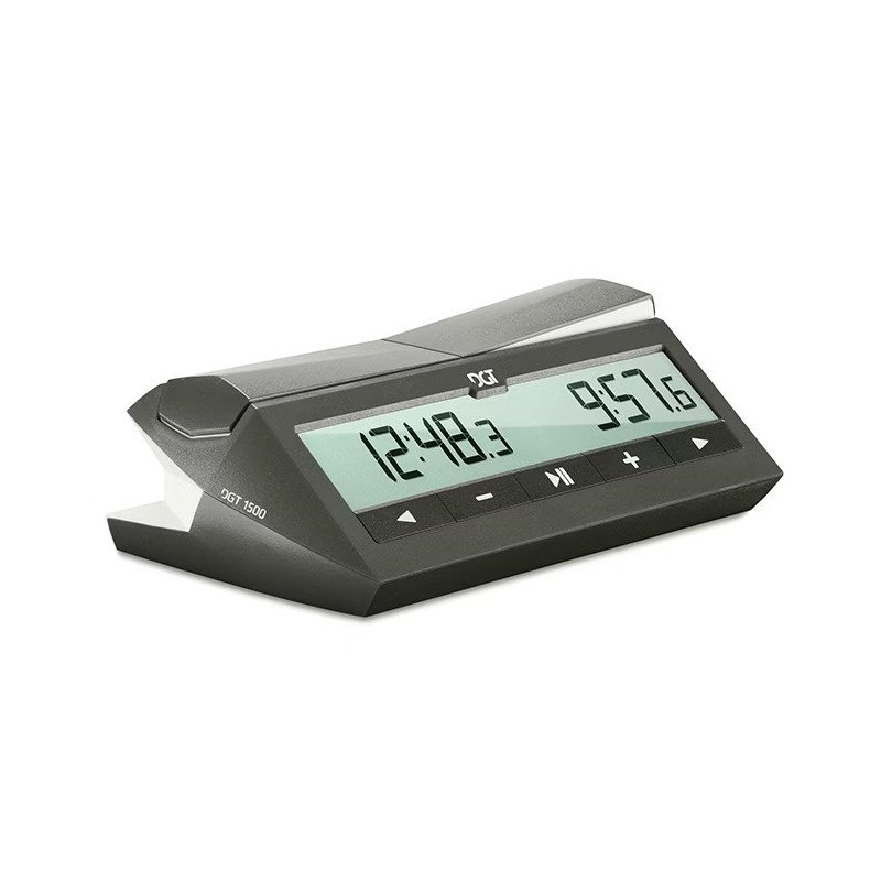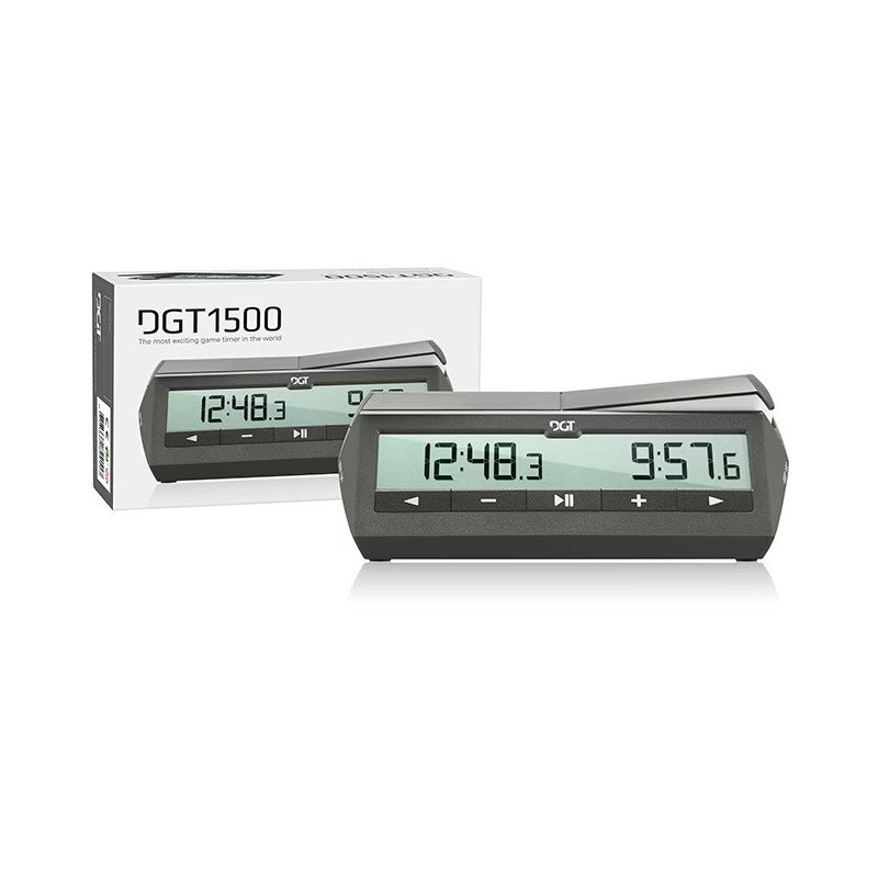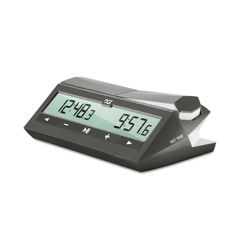 DGT 1500 pilkos spalvos šachmatų laikrodis idealiai tinka greitoms ir žaibo partijoms. Jis pasižymi aiškiu LCD ekranu su papildomu dešimtųjų sekundžių rodymu, leidžiančiu tiksliai stebėti likusį laiką. Laikrodis siūlo paprastą nustatymą su viena laiko periodu ir galimybe nustatyti skirtingus laikus kiekvienam žaidėjui (time odds). Korpusas pagamintas iš ABS plastiko, o maitinimas užtikrinamas viena AA tipo baterija (pridedama). Laikrodis sveria tik 220 g, todėl yra lengvas ir patogus nešiotis. DGT 1500 yra puikus pasirinkimas tiek mėgėjams, tiek profesionalams, ieškantiems patikimo ir kompaktiško šachmatų laikmačio.